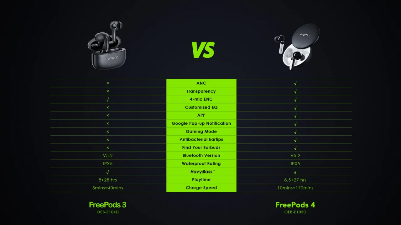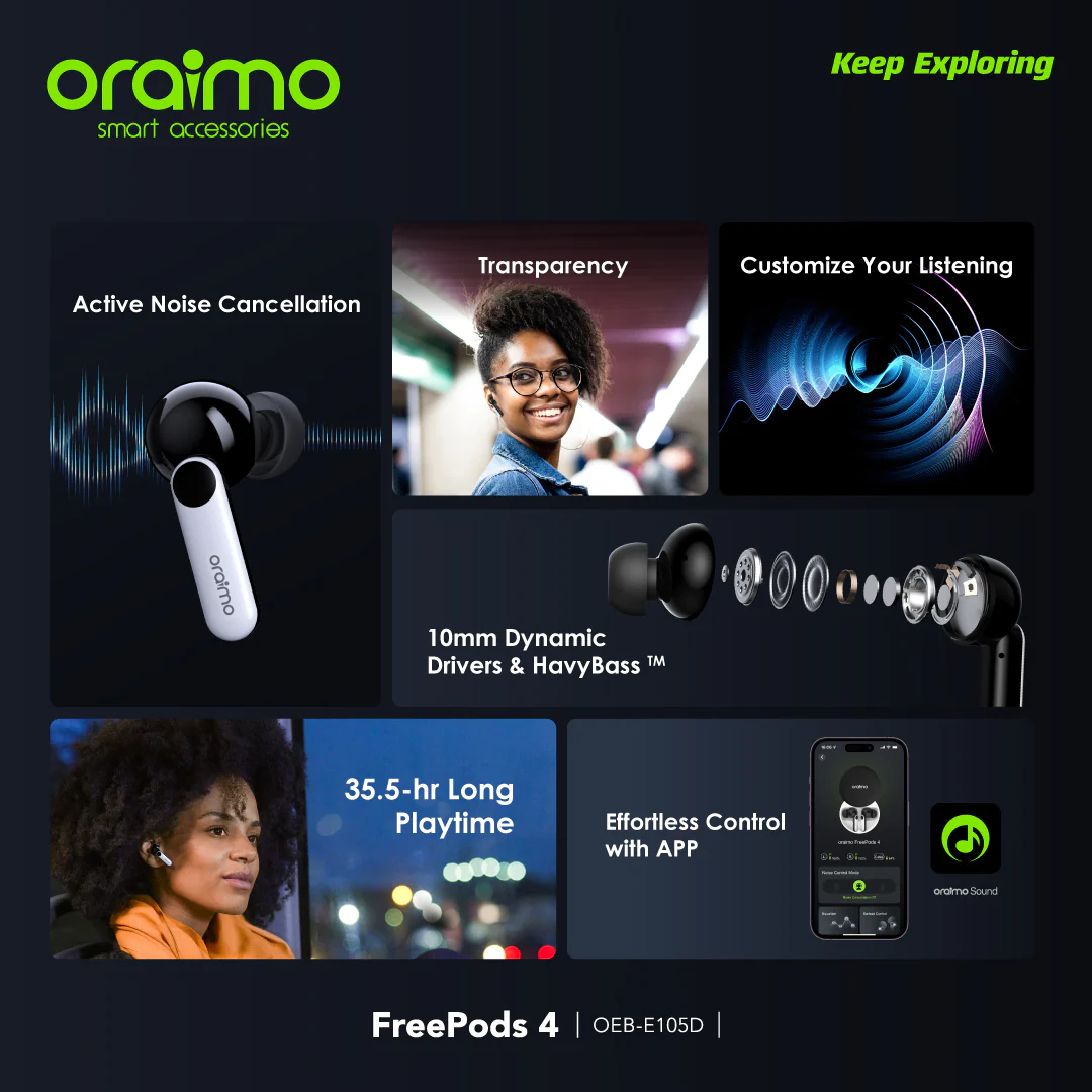 Category: Wireless Earphones Tags: 35.5-hour long playtime, ANC noise cancellation, app control, Google Fast Pairing, Havy Bass, low-latency Game Mode, Oraimo FreePods 4, oraimo Sound APP, premium audio, smart touch controls, Transparency Mode, true wireless earbuds